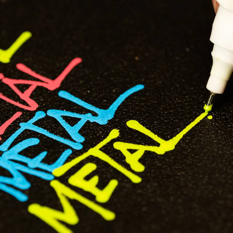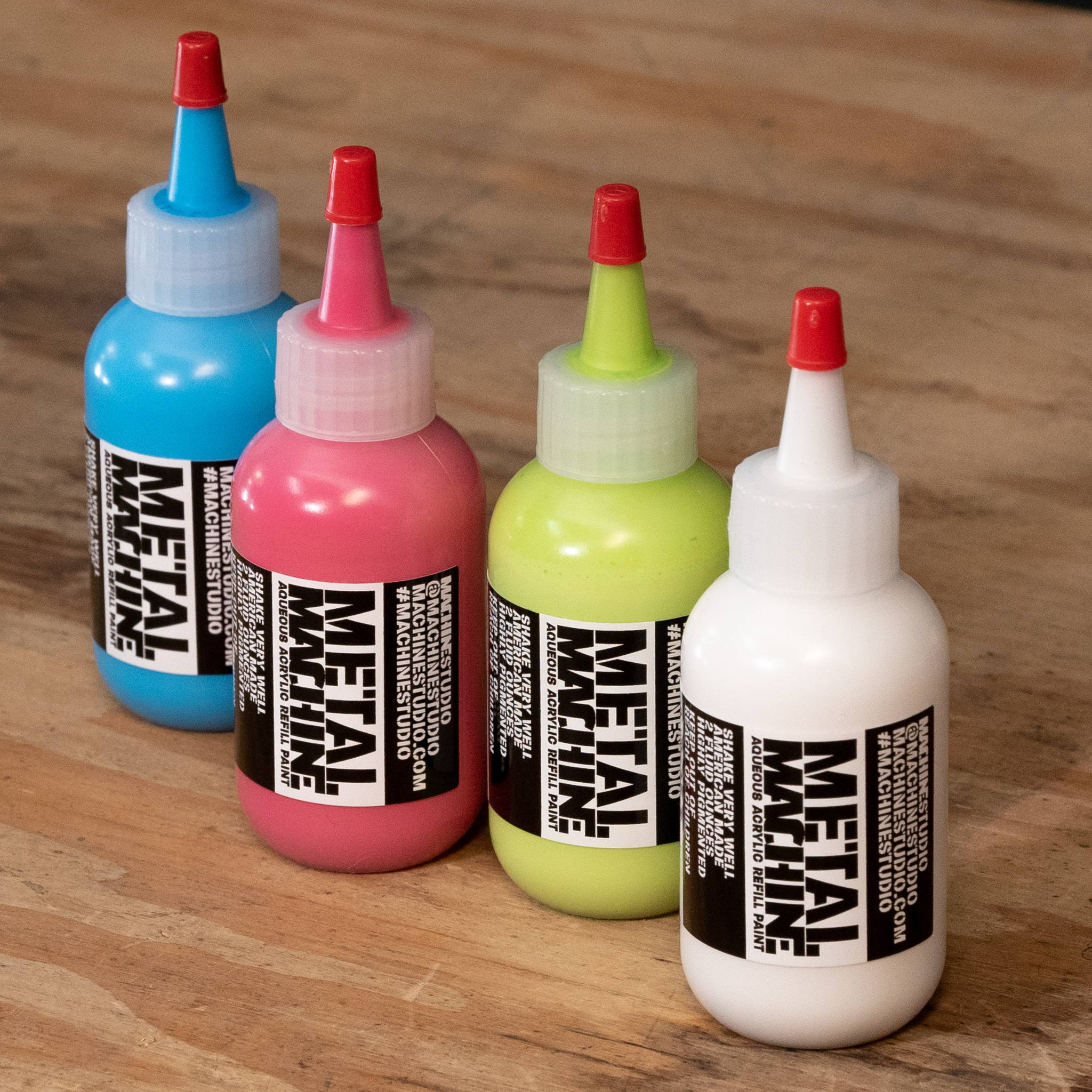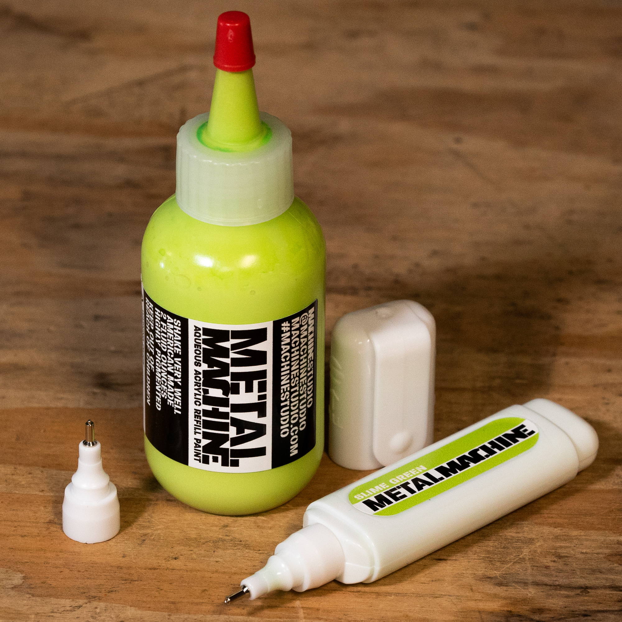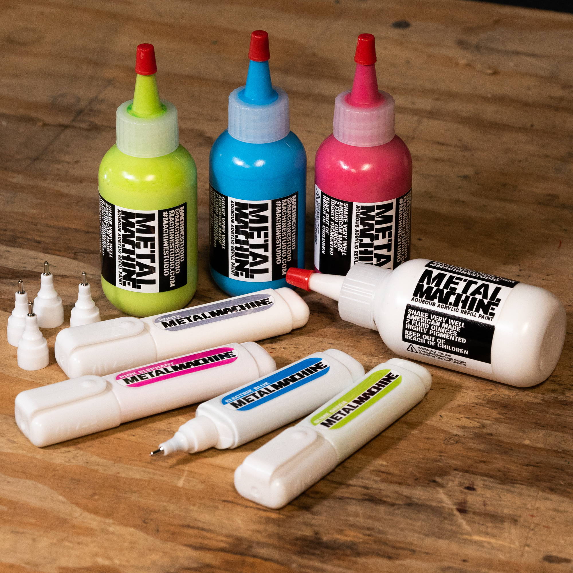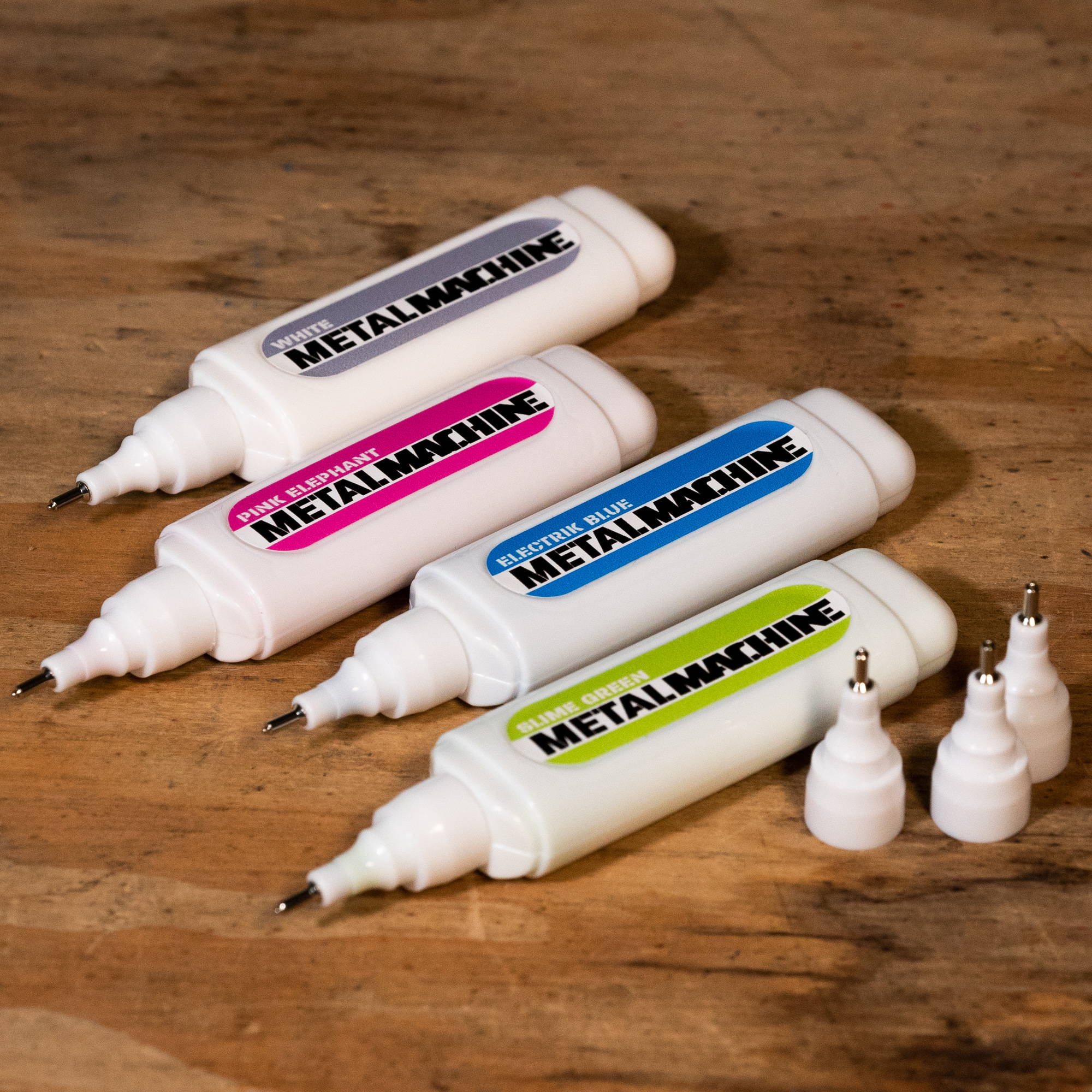 The Metal Machine is a squeezable, metal tip paint marker. The strong metal tip is capable of marking on most surfaces. Great for creating thin, bold lines. Filled with our signature ultra opaque, high flow liquid acrylic paint formula. Available in 4 colors.